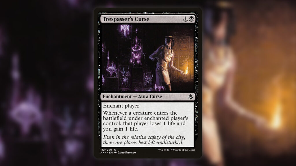 Thanks to another Modern Horizons 3 common, Pauper got a sort of Splinter Twin combo added to the format. Basking Broodscale and Sadistic Glee create an infinitely large Eldrazi Lizard, but it does so by creating an infinite amount of Eldrazi Spawn. Trespasser’s Curse stops that combo in its tracks by draining the opponent for one life each time a creature enters the battlefield. Considering that you’re a burn deck, they should not have enough life to amass a lethal Lizard.