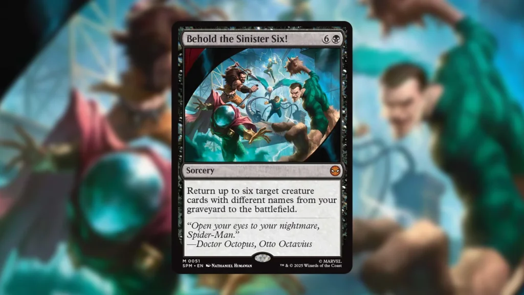 For a splashy seven mana Mythic Rare, Behold the Siniser Six! leaves something to be desired. For two more mana, which isn’t a lot at high mana values like this, Commander players get Rise of the Dark Realms, which resurrects everything. You can alternatively use cheaper cards like Living Death to resurrect more cards from your graveyard for less mana.