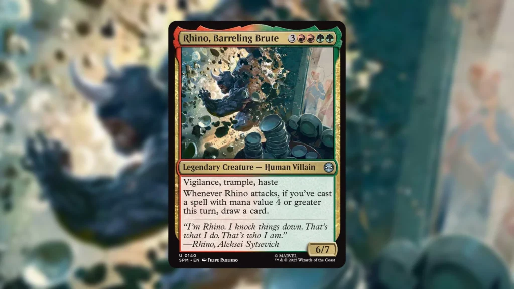 There are far better ways to spend seven mana, but Rhino, Barreling Brute is not the worst card in the world. You get a hasty, burly body that attacks quickly, replaces itself as long as it survives to the combat step, and offers additional card draw in specialized strategies.