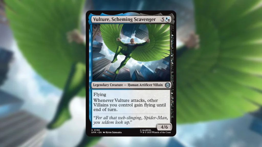 Vulture fans may have gotten done dirty with this card. Provided there aren’t any other Vulture cards in the set, Vulture, Scheming Scavenger won’t be seeing much play outside of limited. This understatted Villain has a relevant effect in Limited for Villain Typal decks, but giving all of your Villain creatures Flying is not worth the exchange in any other format.