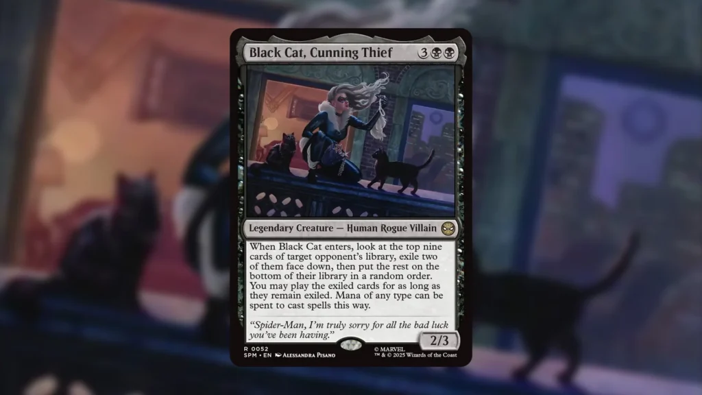 Black Cat, Cunning Thief goes nuts if you can flicker her. Copying this card’s enters ability, or Blinking it repetitively, will basically allow you to start playing your opponent’s deck. Commanders like Gonti, Canny Acquisitor that are interested in playing opponent’s cards will love Black Cat, Cunning Thief.