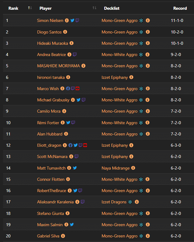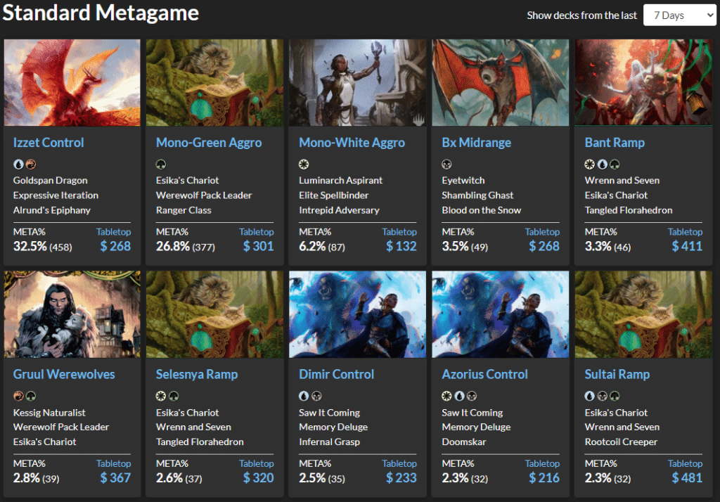 Looking at the standard meta breakdown over the last week, We can see a massive disparity between Izzet Turns, Mono Green Aggro and the rest of the format. With Izzet Turns sporting near 33% metagame share and Mono Green Aggro right at 27%, there isn’t much room for other decks to really compete. The next deck down is Mono White aggro, coming in at a measly 6% metagame share. We even have some tournament data to back this up from the weekend.
