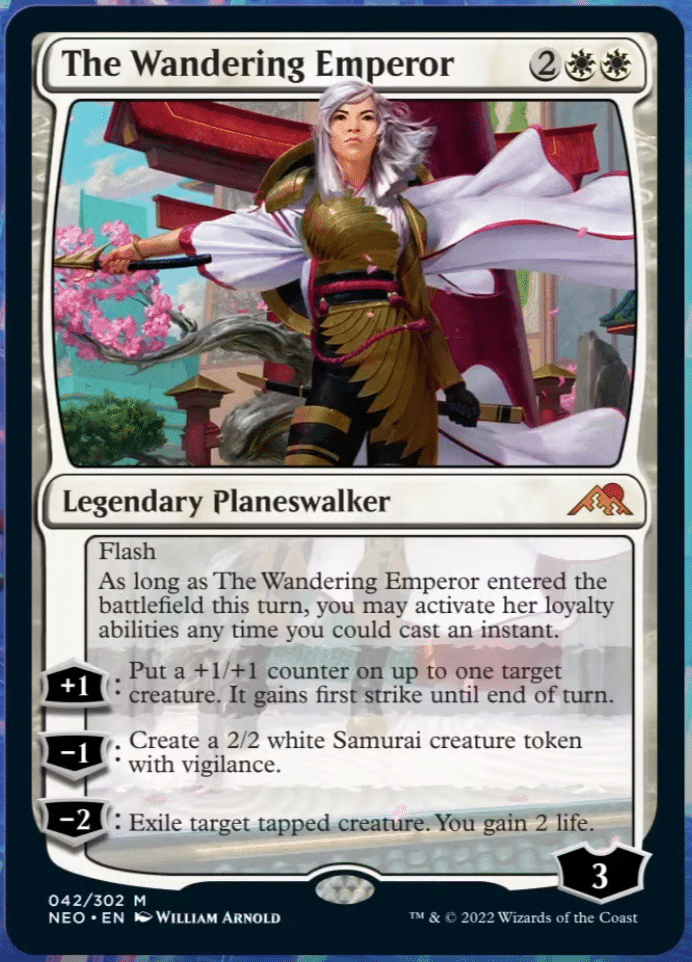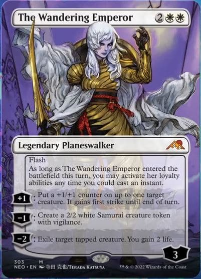The Wandering Emperor is the first planeswalker to ever be printed with the flash. She has an overall strong toolkit of abilities, but the unprecedented potential to be played at instant speed really pushes her over the edge.