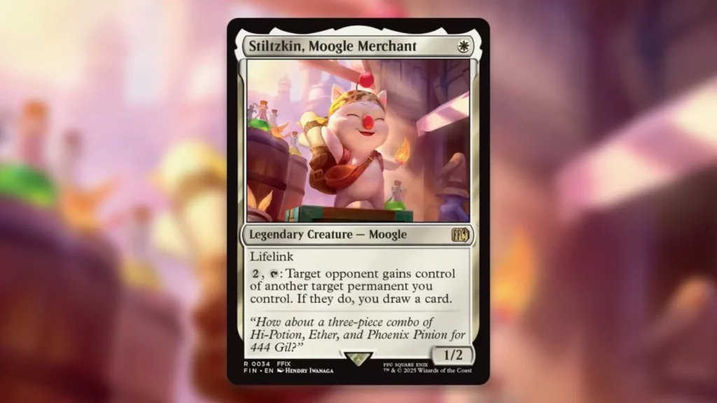In the pantheon of Final Fantasy icons, they don’t come much bigger than the humble Moogle. Introduced in the series’ third entry, these bizarrely cute creatures have returned again and again. Naturally, they also appear in the Magic: The Gathering x Final Fantasy Universes Beyond set. So far their sole representative in MTG is Stiltzkin, Moogle Merchant, but it’s a clear case of quality over quantity.