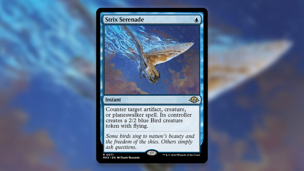 Like Swan Song, Strix Serenade costs one mana and offers the countered owner of the card a Bird for their troubles. This should see ample play in EDH and cEDH, and could easily see play in Modern depending on how the metagame develops. That said, a 2/2 flying Bird token is much more dangerous in two-player constructed formats than Commander.