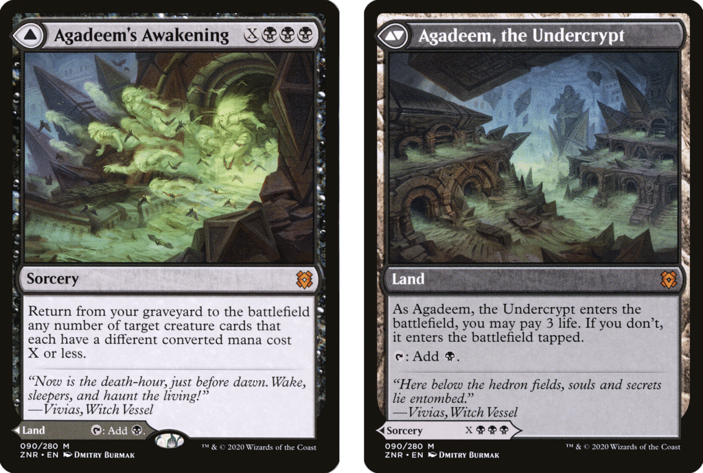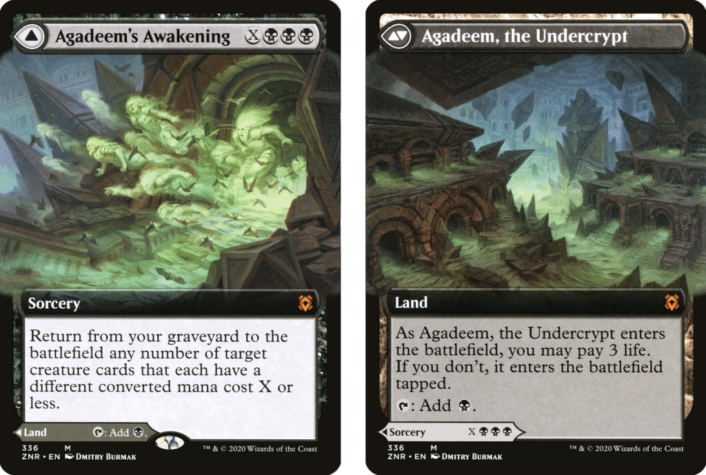 As part of the cycle with Sea Gate Restoration, Agadeem’s Awakening is one of the most valuable cards in Zendikar Rising. As a Sorcery, you can return any number of creature cards from your graveyard depending on the mana value and costs paid. If you don’t fancy that, you can use it as a Black mana source and trading away three life for it to come into play untapped.