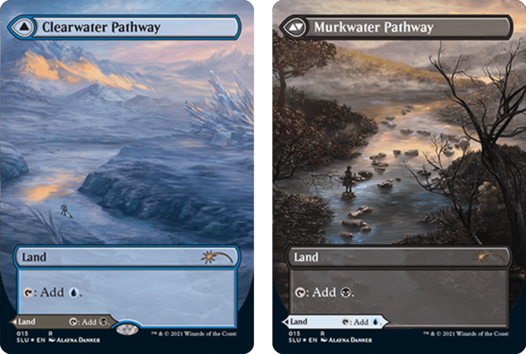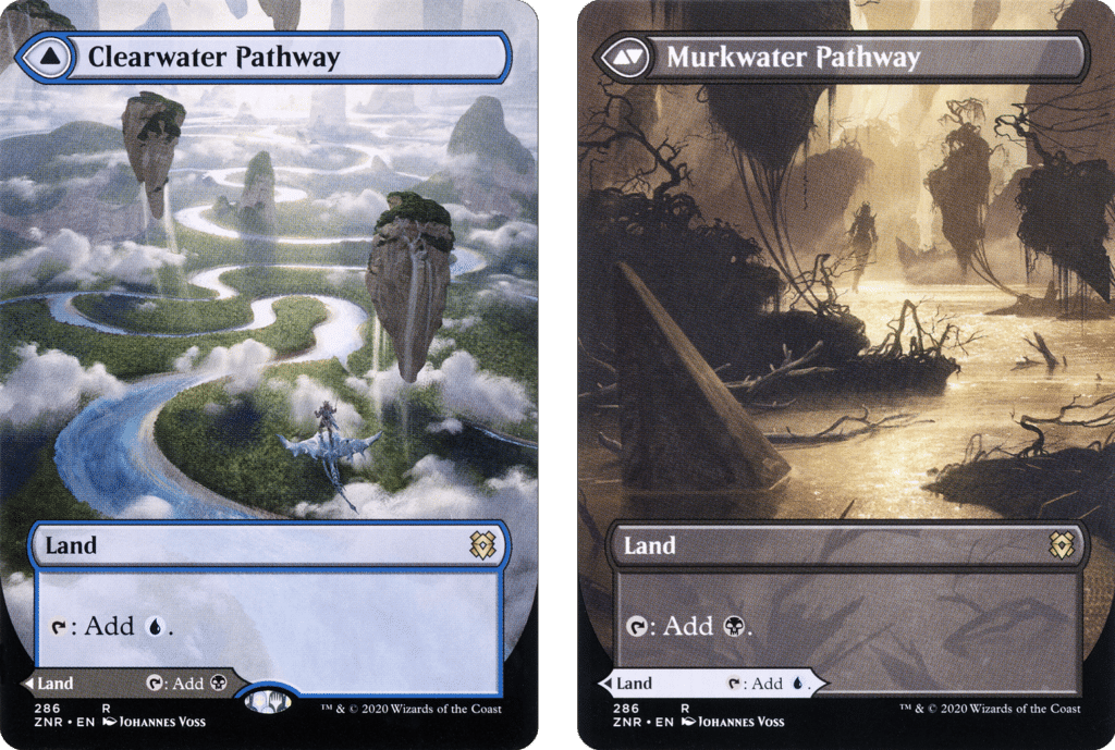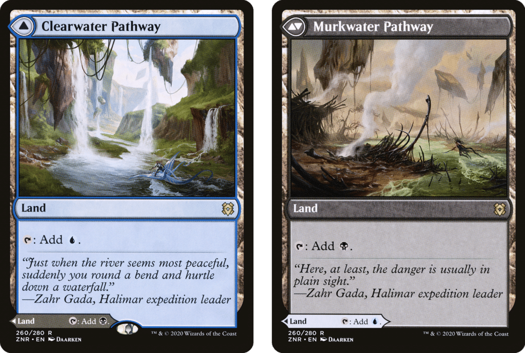 Out of the cycle, Clearwater Pathway is currently the most valuable since Rogues are viable in Standard, Pioneer, and Commander. Also, eager players are looking to upgrade their Undead Unleashed preconstructed Commander deck, where Clearwater Pathway slots right in. Grabbing these Pathway lands over time is a sensible approach since these will see heavy play in Standard and Pioneer, also they make for great budget placeholders for shock lands in older formats.