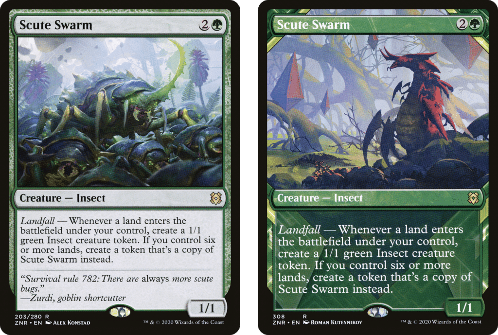 A card that causes countless crashes on MTG Arena, Scute Swarm is brimming with combo potential. If you control more than six lands and have a Scute Swarm in play, you make a copy of the Insect where it’ll trigger again whenever a land enters play.