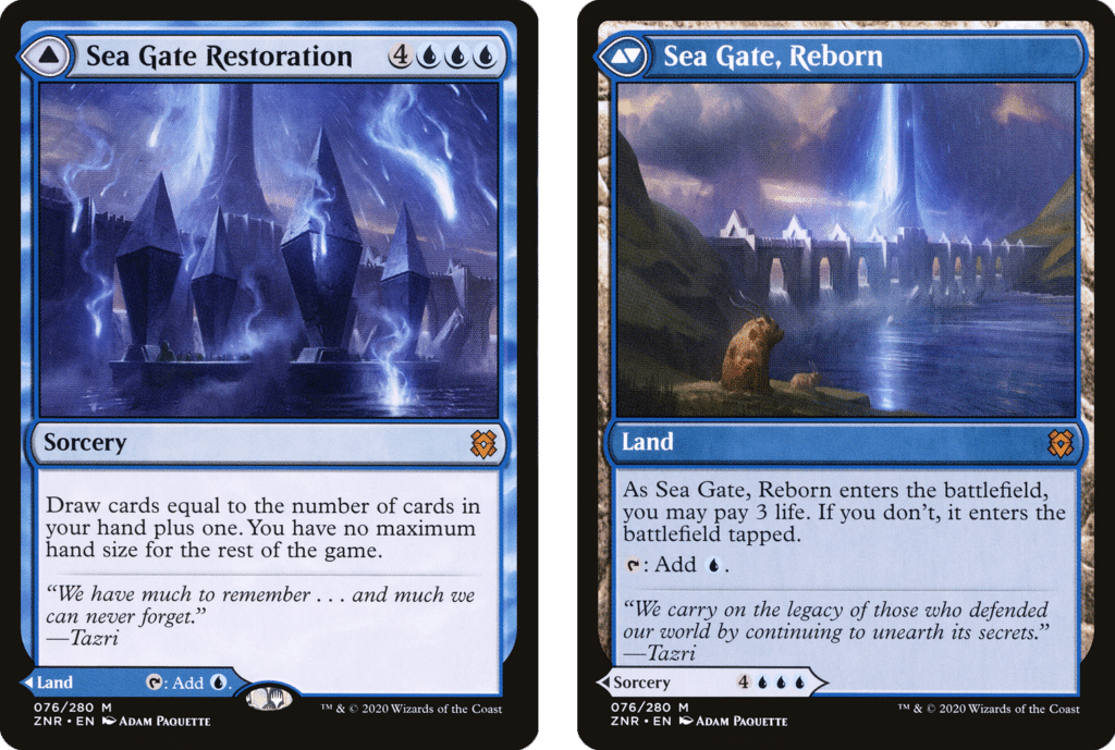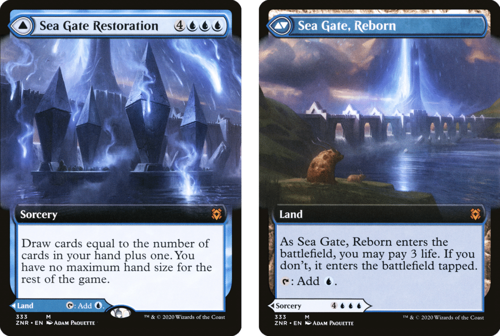 With Zendikar Rising‘s release, a new cycle of Mythic lands is making waves in Standard, Modern, and Pioneer. What makes these lands so intriguing is they are double-sided with a spell on the backside, providing you with the option to either play it as land or cast it as a spell. These also have the option to come in untapped if you trade three life to do so, but Sea Gate Restoration is one of the more eternally played out of the cycle.