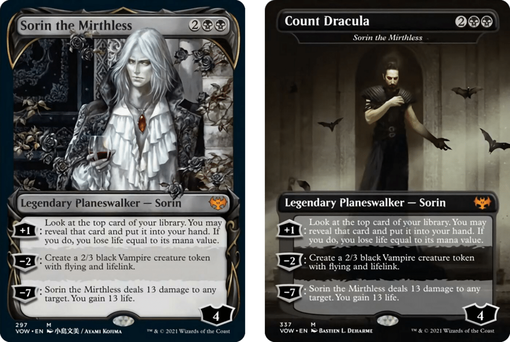 The ability to make a 2/3 flying token, or to look at the top card of your library is enough to impact a game of MTG right away. In these styles of decks, you are often accruing plenty of life so losing life from Sorin’s first ability is a non-issue. Expect the variations of Sorin the Mirthless to be in demand, especially the Fang Frame variant which Ayami Kojima (of Castlevania fame) created the art for. This variant is likely to be the most expensive of the lot given the attachment to the video game franchise.