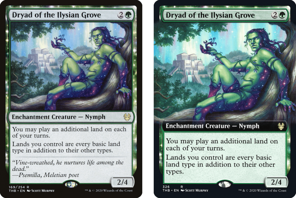 Another card that sees extensive play is Dryad of the Ilysian Grove due to its ability to smooth out your mana base. In Commander, you see the Nymph in most Green-heavy lists as it allows you to ramp into bigger threats. Not only that, it offers a frustrating 2/4 stat line that stems any aggression from your opponent.