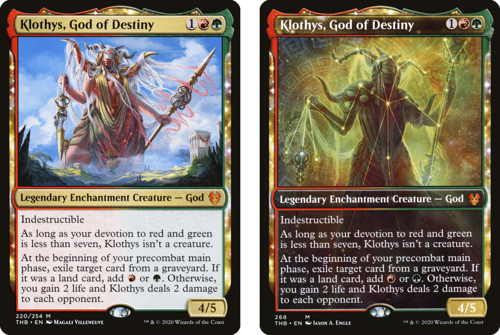 Theros Beyond Death reintroduced the Gods which saw a new addition in Klothys, God of Destiny to replace the now defeated Xenegos, God of Revels. For three mana, you get incidental graveyard hate with the ability to ramp or deal damage depending on what was exiled. If your devotion to Red and/or Green is more than seven, the Legendary God becomes a creature so you can get aggressive if you fancy it.