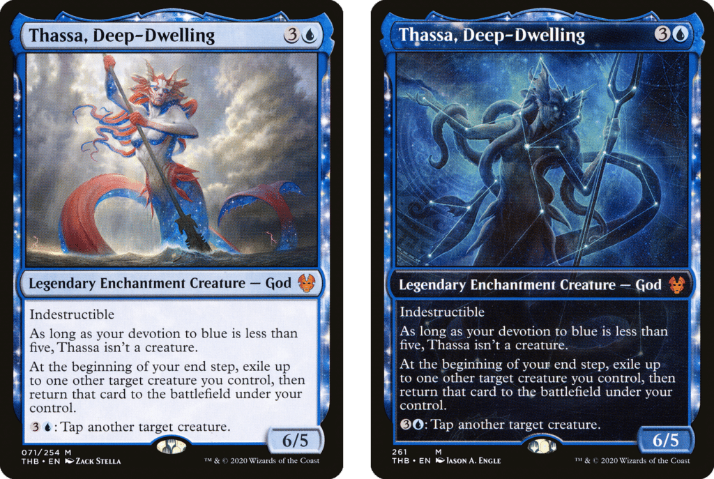 Speaking of Gods, Thassa, Deep-Dwelling is one of the more played Gods in Commander. For four mana, you get a repeatable blink effect allowing you to get extra value out of your creatures. Also, if your devotion to Blue is higher than five, you have access to an indestructible creature that is able to pile on the damage quickly.