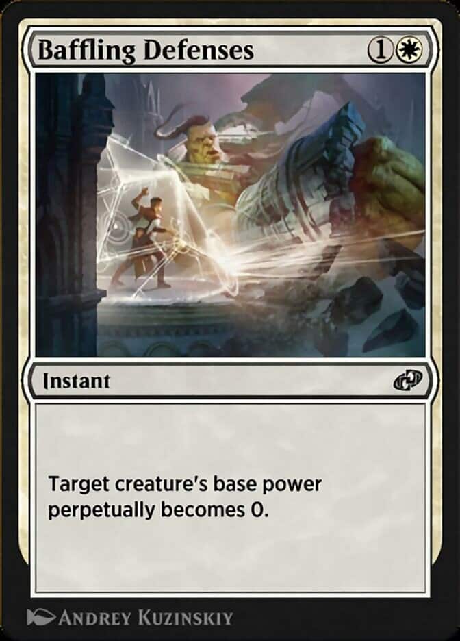Baffling Defenses is our honorable mention today. This card is a two mana White Instant that has a Creature’s base power perpetually become 0.