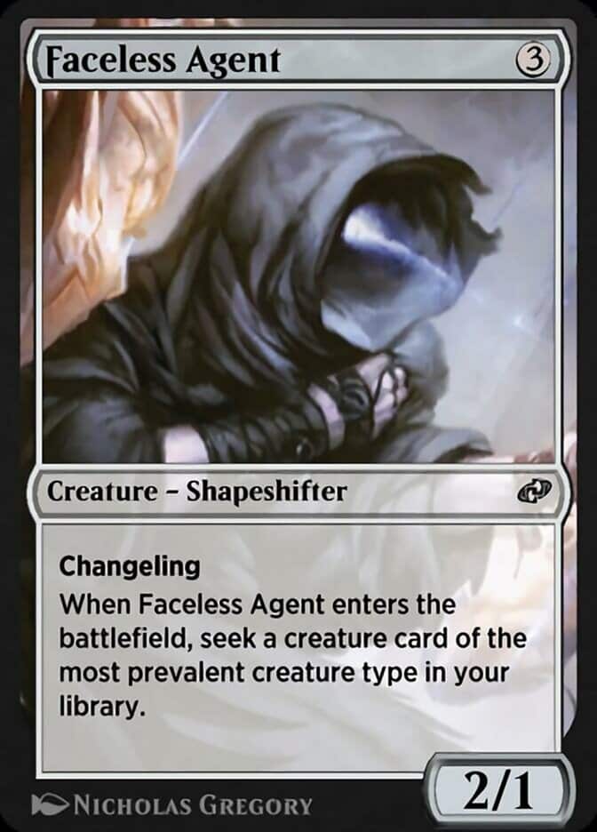 Our first proper choice is Faceless Agent, a three-mana 2/1 Changeling. When they enter the battleifled, you get to seek a Creature card of the most prevalent Creature type in your library.