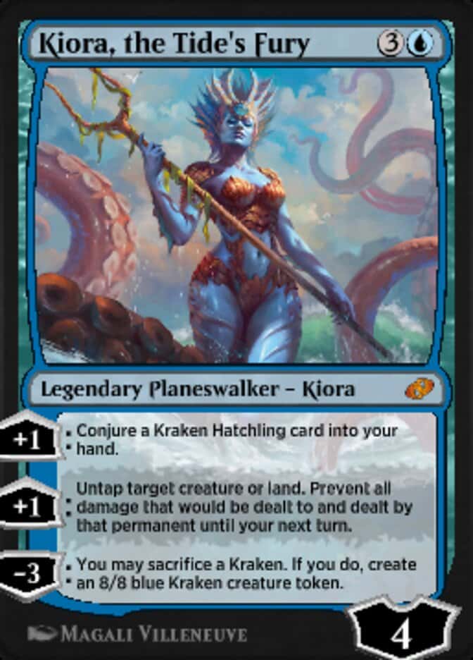 Kiora, the Tide’s Fury is a four mana Blue Planeswalker that comes in with four loyalty. You can add one to conjure a Kraken Hatchling into your hand. Or, you can add one to untap a Creature or Land and prevent all damage that would be dealt to and by it until your next turn.