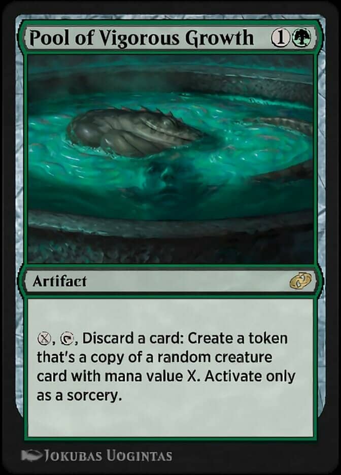 This card is number one on the list of our hearts. Pool of Vigorous Growth is a two-mana Green Artifact that you can pay X, tap, and discard a card. You can only do this at sorcery speed, but the effect is absurd.