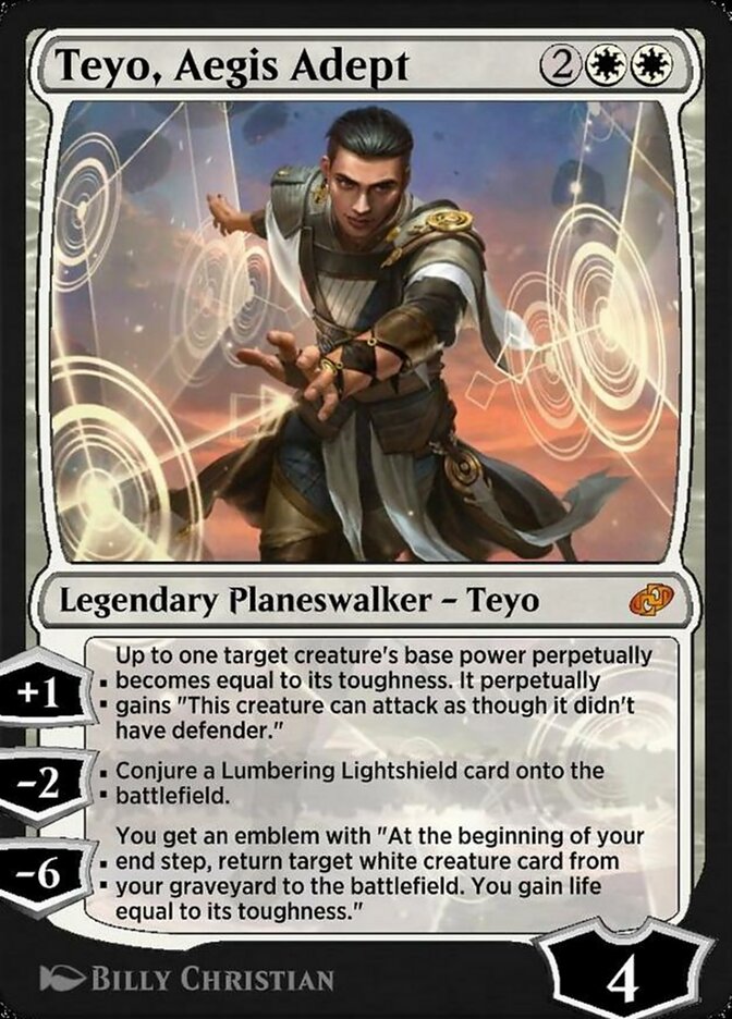 Do you like Walls, Teyo does. For four mana, Teyo, Aegis Adept, is a White Planeswalker that comes in with four loyalty. You can gain one loyalty to “Up to one target creature’s base power perpetually becomes equal to its toughness.” This also allows the Creature to attack as though it didn’t have defender. You can pay two loyalty to conjure a Lumbering Lightshiled to the battlefield.