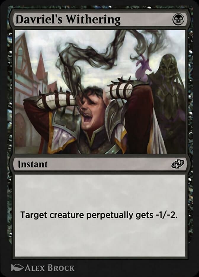 Davriel’s Withering lets you pay one mana to perpetually give a Creature -1/-2. It’s an incredibly simple effect, but it’s also probably the most obnoxiously abusable card on this list.