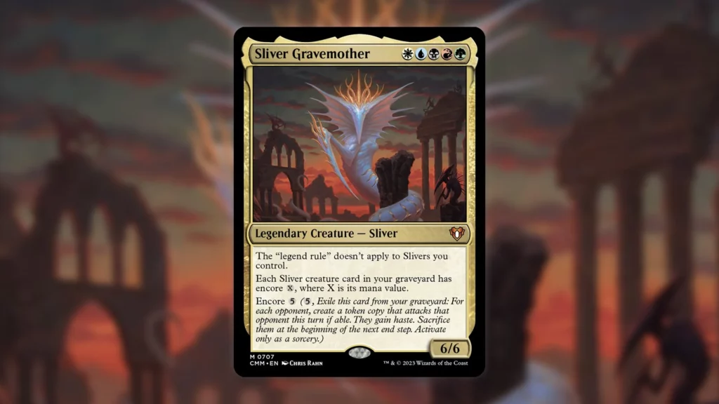 The face Commander from the recent Commander Masters Sliver Legion precon, Sliver Gravemother is built with Commander Slivers in mind. These creatures are fantastic at flooding the board with Slivers that scale, but like most creature decks in Commander, board wipes can be difficult to recover from. Sliver Gravemother helps this particular issue by giving all of your Slivers Encore.