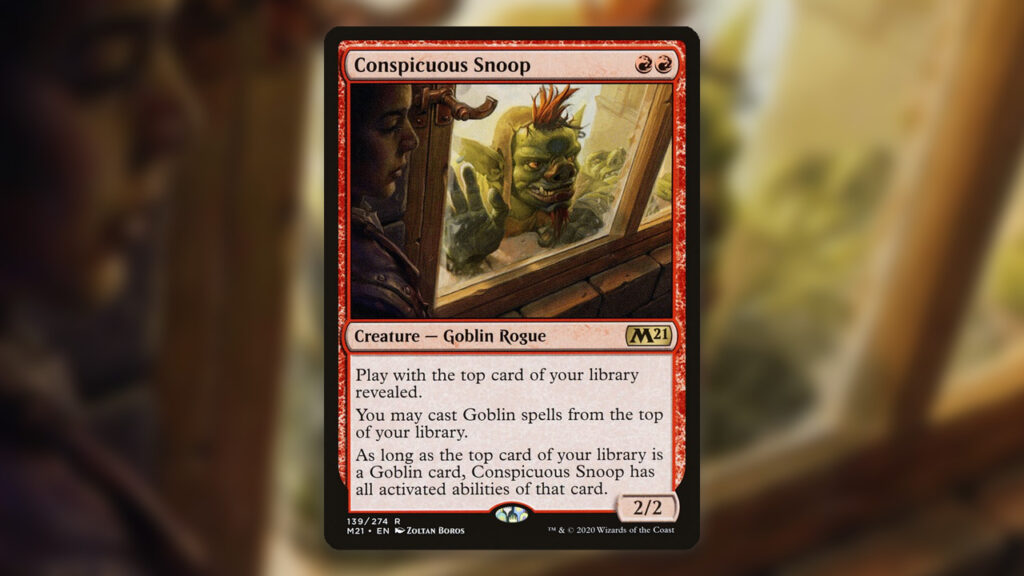 Conspicuous Snoop won’t see play outside of a dedicated Goblin Typal strategy, but it is arguably your best payoff for that strategy. Able to gain the activated ability of any Goblin on top of your library, the Snoop can easily go infinite. Should you have a Kiki-Jiki, Mirror Breaker on top of your library, you can create infinite copies of the Snoop. From there, if you have a way to manipulate the top of your library, swap over to a Sling-Gang Lieutenant and sacrifice all your creatures!