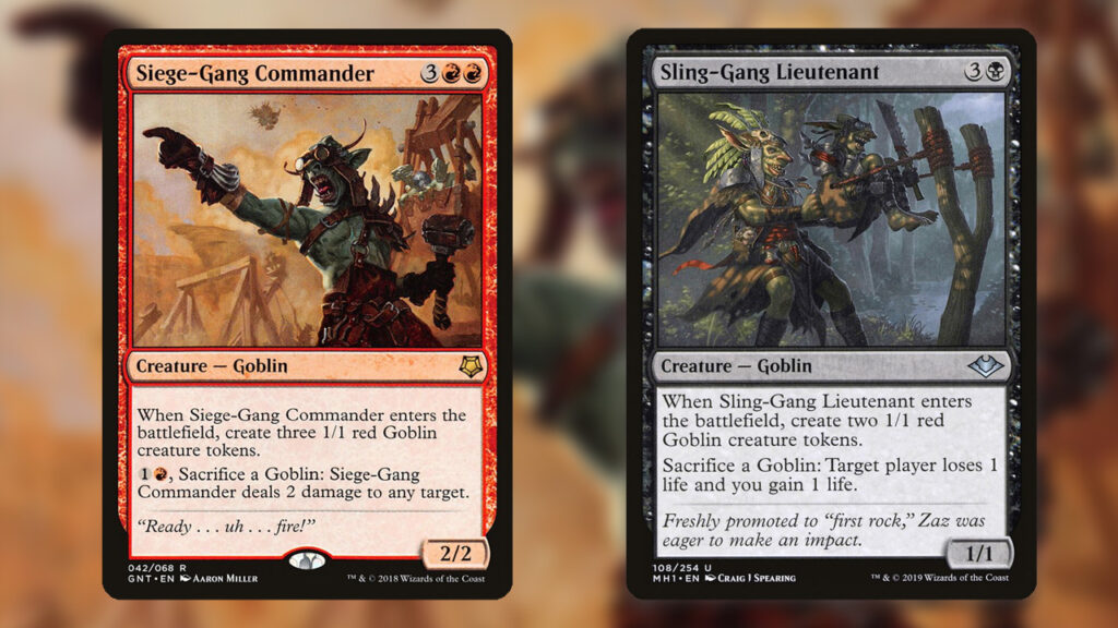 Then, you have Sling-Gang Lieutenant from Modern Horizons which pack lifegain if you want to preserve your life total. This card is also the end result of a bunch of infinite combos commonly found in Goblin Typal strategies.