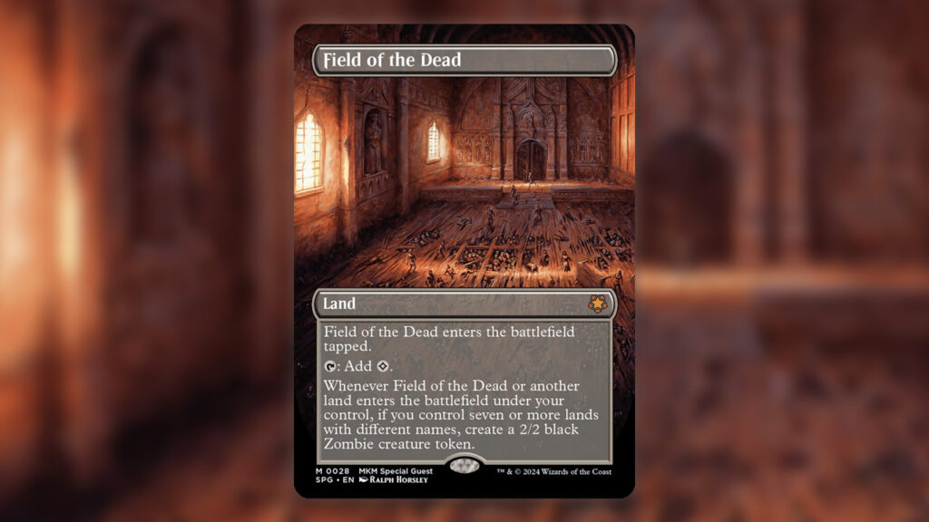 Field of the Dead is one of the Special Guest cards appearing in The Murders at Karlov Manor. Field of the Dead is banned in multiple MTG formats thanks to its inevitability. Getting the Field to start producing Zombies is a lot easier than you may think, and once this card starts producing creatures, it is very hard to shut the door. Beating a Field of the Dead deck generally involves either an infinite combo or putting enough pressure on the deck before it starts producing Zombies.