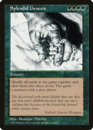 Splendid Genesis is a card gifted to some of Richard Garfield’s friends celebrating the birth of his first child, a girl named Terry. There are two editions of this card that exist. The one pictured above is the more common one, of which we know that there are 110 in existence.