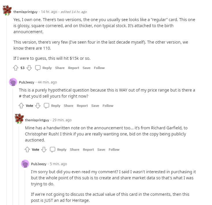 As mentioned by Redditor themisprintguy, one of the few owners of a copy of Splendid Genesis, the rarer of these two printings was on the birth announcement Garfield handed out to his friends. As such, there are likely around only 100 copies in existence (or less), with themisprintguy only seeing four in the last decade. This version of Splendid Genesis has reappeared for auction on Heritage Auctions. It is important to note that this is the first time that the rarer version of Garfield’s Splendid Genesis has appeared for public auction. A picture is provided in the link provided in this paragraph with this information attached: