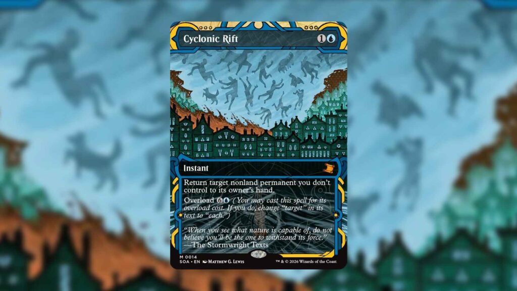 While you never really want to use the two-mana mode of this card, Cyclonic Rift’s Overload spell is absolutely insane. Sending your opponents back to the Stone Age, while leaving yourself untouched, is often enough to run away with the game. Casting this card at the end of your opponent’s turns makes it even more devastating, letting you untap to cement your advantage further.