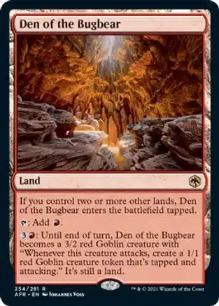 Den of the Bugbear’s ability to enter the battlefield untapped in the early turns of the game gives this card a lot of appeal compared to traditional creature lands like Raging Ravine. This holds especially true in an aggressive color like red.