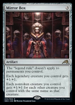 Mirror Box does the exact same thing that Mirror Gallery does, except it costs two less mana to play, is a Glorious Anthem for legendary creatures, and acts as a Coat of Arms for creatures of the same name.