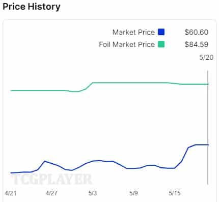 Hopefully, Wizards of the Coast reprints this Commander staple soon as it definitely needs one. It’s never had a reprint (besides a Judge Promo), and keeps trending up in price, with the most recent development being a spike from $55.00 to about $60.00 for lightly played copies.