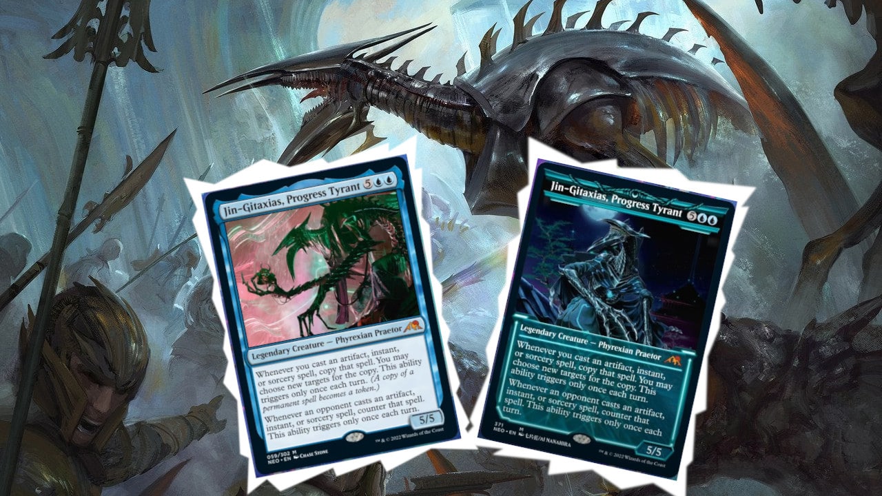 Jin-Gitaxias, Progress Tyrant, is the newest iteration of the blue Phyrexian Praetor, and certainly lives up to the legacy of Jin-Gitaxias, Core Augur. Check it out: