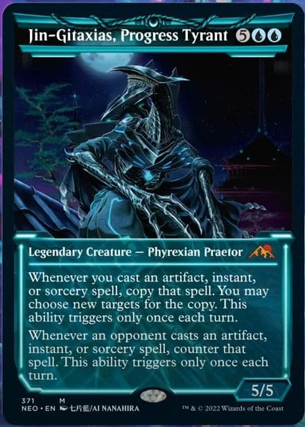 Jin’s first ability copies the first artifact, instant, or sorcery spell you cast each turn. There are countless crazy spells that this ability can copy, many of which can almost win you the game.