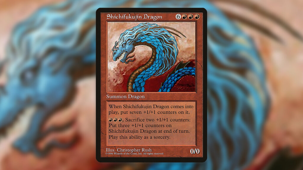 Much like the 1996 World Champion, Shichifukujin Dragon was a card awarded as a tournament prize. At the time, Magic was still expanding its worldwide reach, but was taking off in Japan pretty aggressively. According to an article from Magic Untapped, a “Duelists’ Convocation International Tournament Center was in the works in Tokyo.” This dragon, designed by Mark Rosewater and Christopher Rush, was given as a way to make the opening something truly special. However, because of the timing of the request, Rosewater was given one hour to design the card.