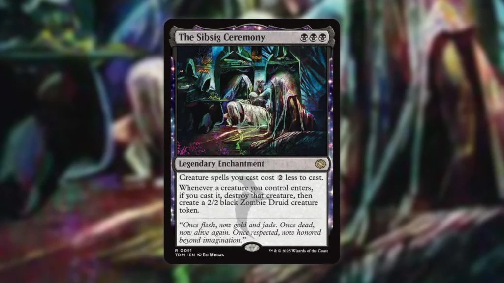 The enchantment we’re referencing is called The Sibsig Ceremony. The Sibsig Ceremony is a very weird design. For three black mana, you get a Heartless Summoning variant with a bit more going on. Your creatures all cost two less mana, but when you cast them, they immediately die, and you get a 2/2 Zombie Druid token instead.