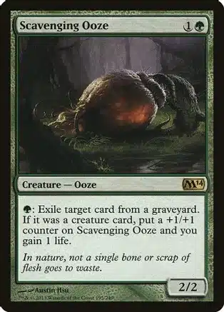The main appeal of Scavenging Ooze over Lion Sash is Ooze’s ability to gain life. This makes Ooze a good sideboard option against aggressive decks like Burn. But Ooze’s life gain and +1/+1 counter are conditional, depending on whether the card exiled to Ooze’s ability was a creature or not.