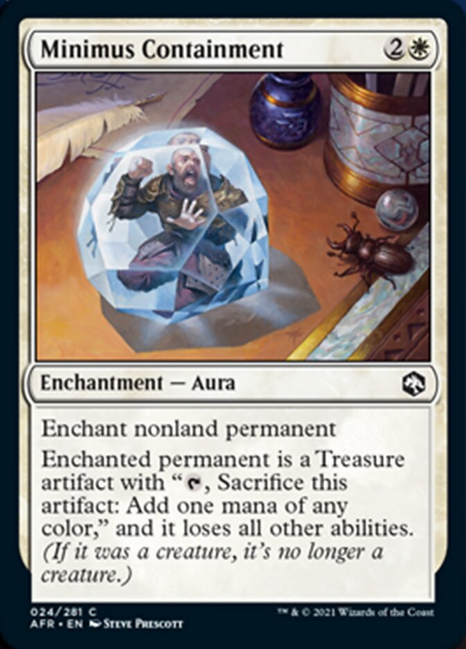 However, one of our favorites so far is Minimus Containment. Minimus Containment is a three mana Enchantment Aura that allows you to a nonland permanent into a Treasure token, and that card also loses all of its other abilities.