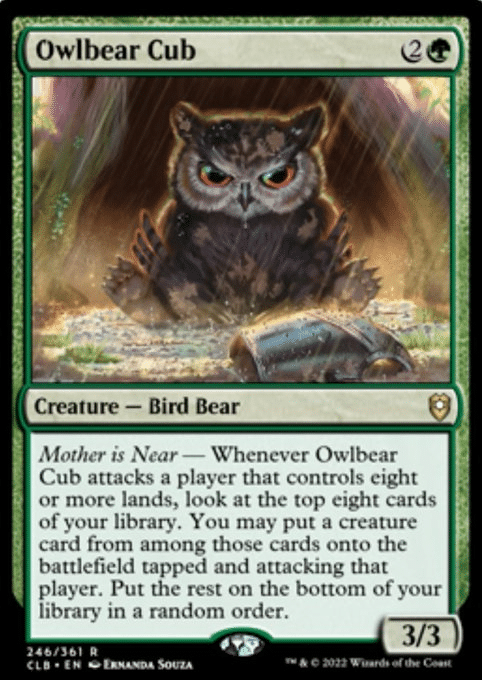 First up, we have the ever famous Owlbear Cub! The Owlbear Cub is a tiny beast that shows up in many a campaign, and when there’s a cub, there’s always a mama! When it attacks, if the opponent that you’re attacking has 8 or more lands, you look at the top 8 cards of your library. Then you can put a creature from among those 8 onto the battlefield, tapped and attacking that same player.