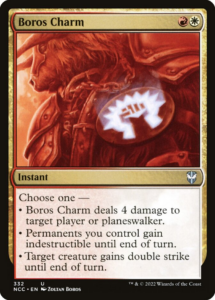 Many of them, like Simic Charm, offer not only big value but also game ending power. Two mana to give your commander +7/+7 is strong and easily translates into killing someone with commander damage in just two or three swings. Bouncing a creature is an acceptable form of disruption for two mana, but when you add a buff and a scry two on top of it, it becomes busted. Finally, you have another protection spell for Aragorn to keep them in play.