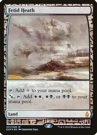 Fetid Heath is included in some more fringe decks of the Modern format. But it is picking up a bit in play nevertheless. Small Pox decks lean on the filter land to consistently cast the deck’s namesake spell on turn 2 in conjunction with Flagstones of Trokair.