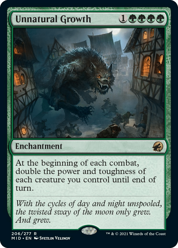 The real banger of this deck is Unnatural Growth. We usually are going to have a decent sized board of creatures, some with trample, so having this powerful effect helps us really punch damage through easily. The real power in this card is that it happens on our opponent’s turn as well. This often makes combat for our opponent very difficult.