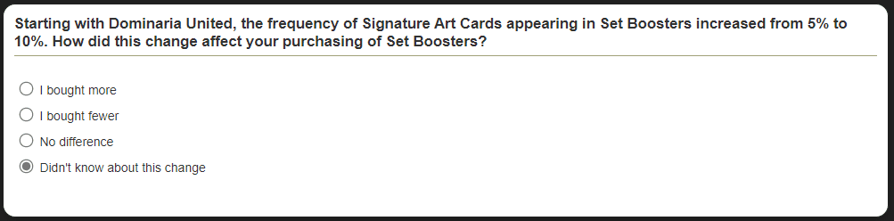 The survey also listed a few MTG facts that look right out of an “X facts you didn’t know about X” YouTube video. While I was personally vaguely familiar with the 15% to 21% rate increase in foil lands, I had no idea about the Signature Art Card increase.