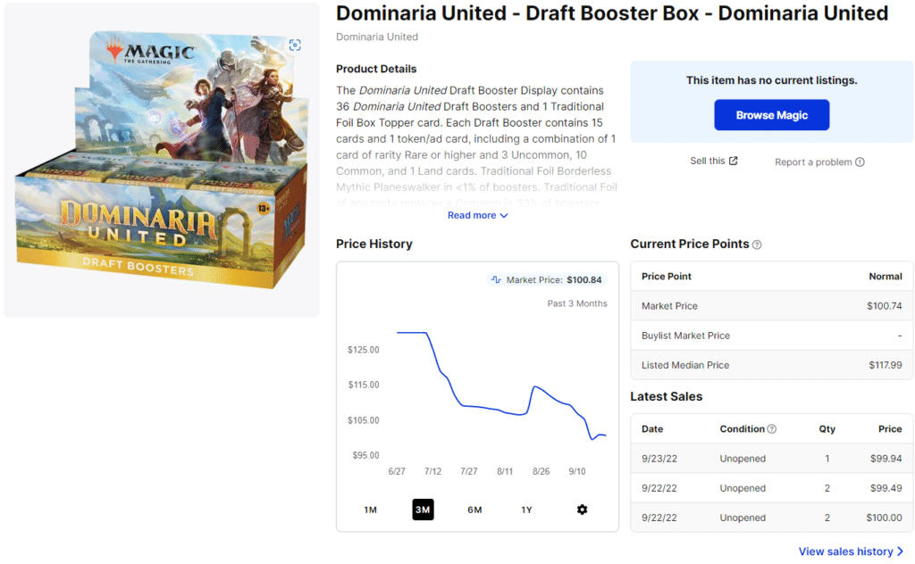 While this isn’t directly related to the survey, consider this background information for a question posed. We previously discussed how sales suggest a grim future for Draft Booster products. Numbers weren’t adding up, and it became clear that some sellers may have been offloading their Draft Booster Boxes for a loss. Fortunately, following this article, a slight jump in sales average seemed to rectify the issue. Unfortunately, as seen by the sales data above, Draft Booster Boxes for Dominaria United are now selling for lower than ever before.