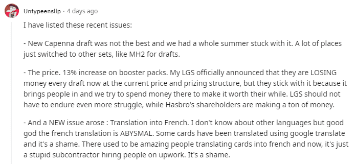 If some sellers offloading products for a loss in the past was a reasonable conclusion in the past, it is now more reasonable than ever. Due to the price increase that Wizards of the Coast products have suffered as a result of “the costs of goods, transportation, and manufacturing have increased significantly and steadily for just about everyone across nearly every industry,” the Booster Box prices that customers have come to expect from their LGS just aren’t cutting it anymore.