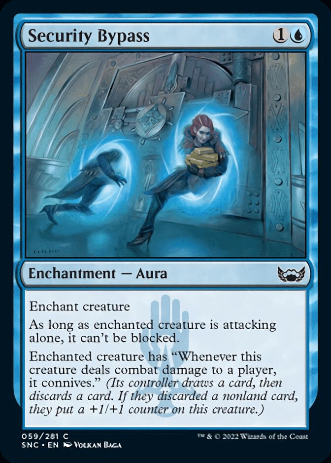 The new card we’ll be talking about is Secruity Bypass. This is a 2 mana Aura, and when the enchanted creature attacks alone it can’t be blocked. When it deals combat damage, that creature connives.