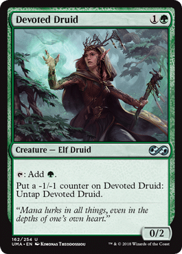While it may seem tempting to slap this on a planeswalker, that’s the fair usage of the card. Where this gets nuts is when this is put on a creature, and a very specific creature, Devoted Druid.