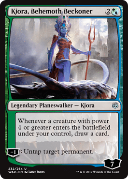 The next couple ones are great choices from War of the Spark, Huatli, the Sun’s Heart and Kiora, Behemoth Beckoner are both 3 mana, and come in with 7 loyalty, which can pose a serious threat very early on in a game.