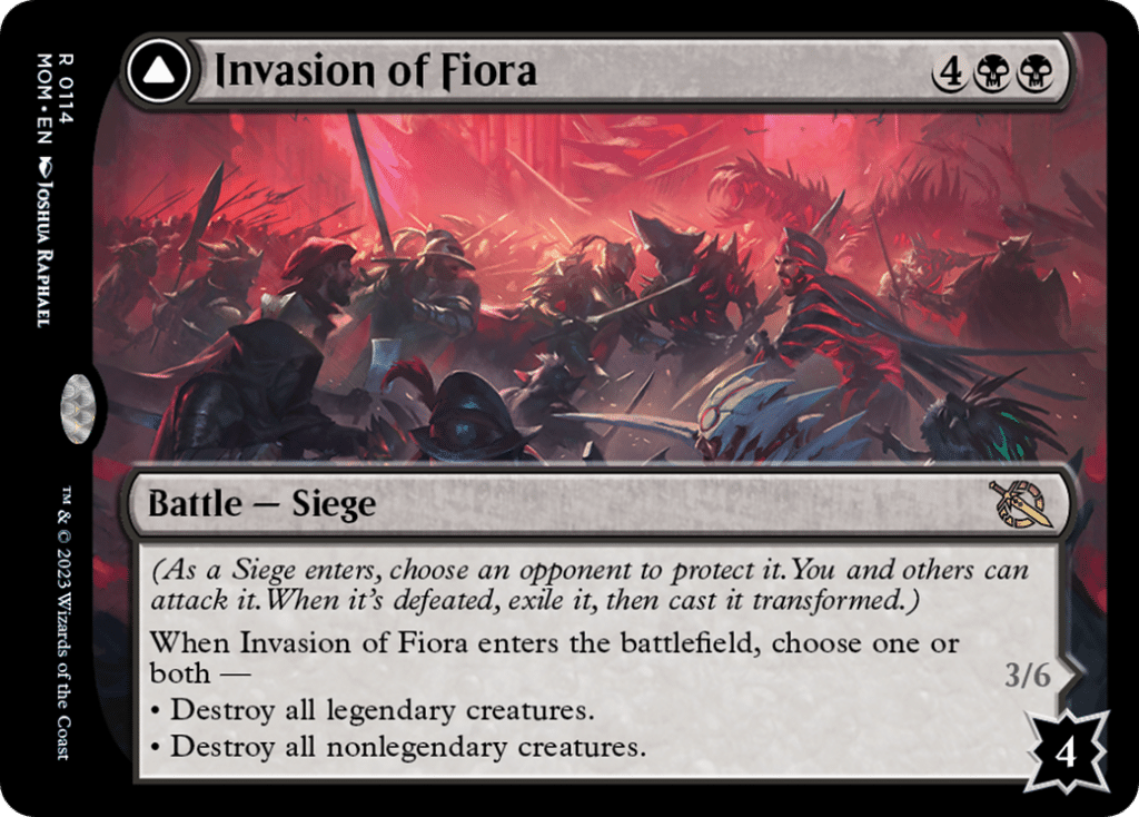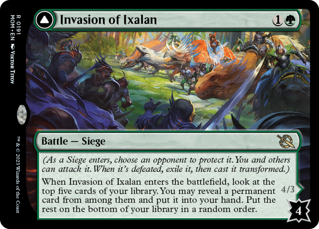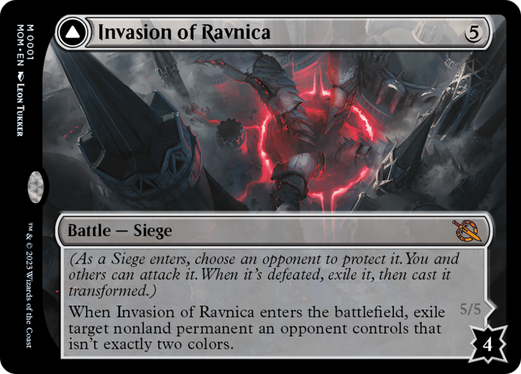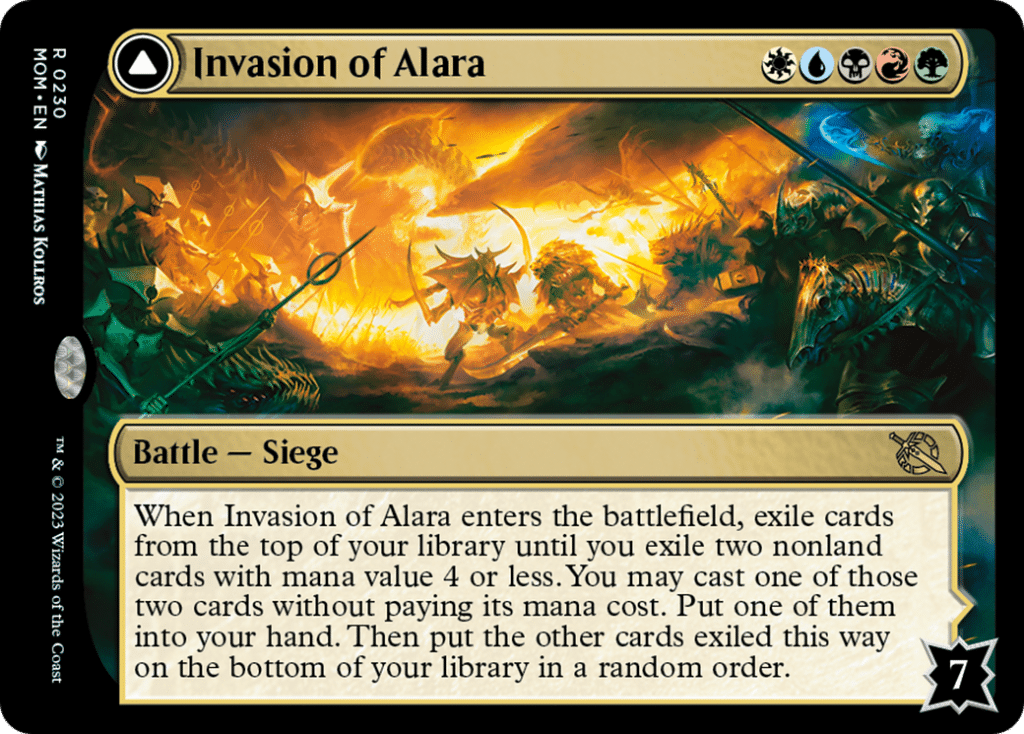 In terms of raw power, Invasion of Alara is absolutely the strongest Battle card out there. The fact that it can only go in five color decks is the only thing keeping it from the top spot on this list. Invasion of Alara has a slightly better version of the Cascade mechanic. It exiles cards from the top of your library until you find two cards with a mana value of four or fewer. One of these cards then goes straight into play, while the other goes to your hand. While Invasion of Alara does then need to take a pretty significant amount of damage before it will transform, once it does it provides a massive dose of good stuff.